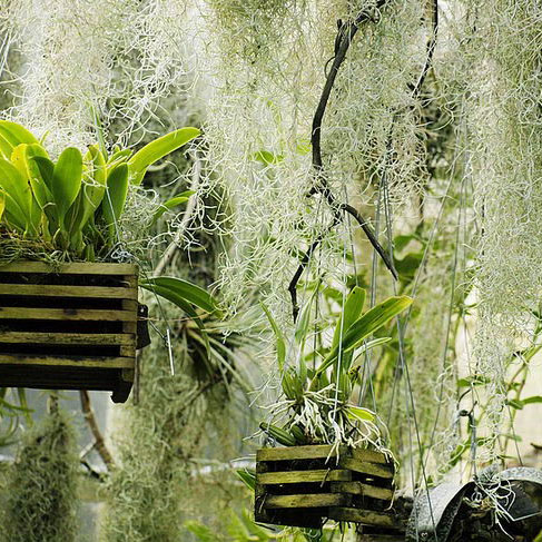 鳳梨科的植物有很多,分成50個(gè)屬,共計(jì)2600多種,我們熟悉的菠蘿就是鳳梨科的植物??諝獠?,又叫空氣鳳梨、松蘿鳳梨、苔花鳳梨、老人須等等,名字很多??諝獠菔区P梨科草本植物,附生在其他植物上。它的莖、枝、葉都是線狀的,葉片上還有很多鱗片。這些鱗片是用來吸收空氣中的水分和養(yǎng)分的,而它們的根主要起固定作用。
